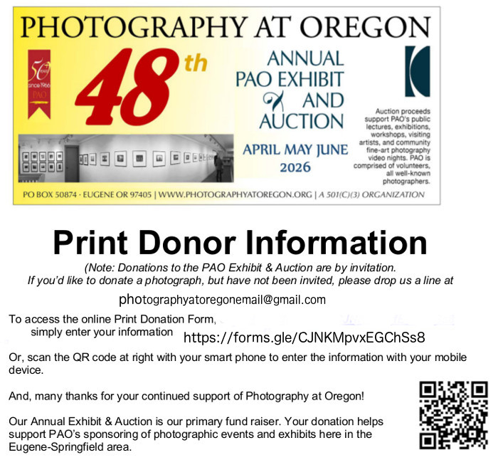 March-June 2022 exhibit in the Gallery at Dot Dotson's, 1668 Willamette Street in Eugenethe forty-fourth annualPhotography at Oregon Auctionopen for online bids April 1 - May 6 athttps://www.accelevents.com/e/PAO2022 enlarge auction posterthe Auction Exhibition appeared in three installments: ![]() exhibit 1 - March 4 - 31, 2022 ![]() exhibit 2 - April 1 - May 6, 2022 ![]() exhibit 3 - May 6 - June 3, 2022 auction catalog |